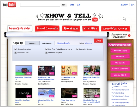 這個網站,行銷人員一定很愛用,據YouTube形容,這個「Show & Tell」網站就是「YouTube上面最有創意的行銷案例的集中地」(Home of the most creative marketing examples on YouTube)!你可以點進「互動式影片」,它就給你看一大堆互動式廣告影片。另外還有「品牌頻道」(Brand Channel),這類的就是企業直接在上面為了某個行銷活動而開的特殊頻道,依CIS製作了版面,放上好幾則影片。另外,「首頁廣告」(Homepages)則秀出企業如何在YouTube上面打首頁廣告,那些動畫怎麼在YouTube上面呈現……。