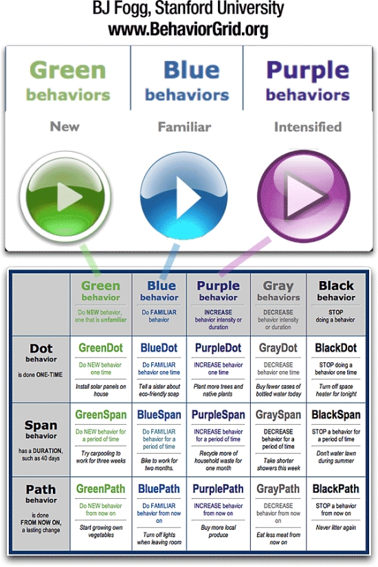所謂「綠色行為」是要求人們做一件從來沒做過的新事情,所謂「藍色行為」則是要求人們「再做一次」曾經做過的事情,而「紫色行為」則是要求人們再「加強」原本就在做的事情,以上三種是企業常常需要人們去做的事情。而後面兩種「灰色行為」與「黑色行為」則分別代表「減少曾經做過的事情」與「完全停止一件事情」,通常只用在政府單位或組織的反煙反毒廣告中。