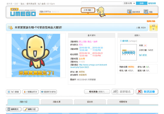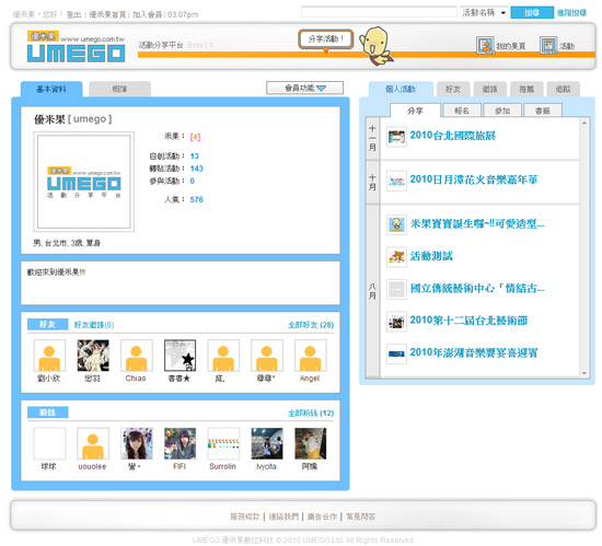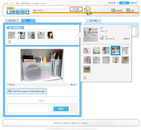 除了活動功能,UMEGO也有置入一些社群必備的功能,而其中最讓我引以為傲的就是UMEGO自行開發的相簿系統。比起目前一般的相簿,UMEGO的相簿藉由Javascript、jQuery、Ajax等程式技術,讓使用者能夠更快速的瀏覽大量的相片,同時卻不會增加系統的負擔,讓相片下載的速度維持在一定的水準。