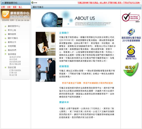 【認證介紹】可攜王不以推銷產品為訴求,而是設計一個便民的平台、透明化的價格,以提供消費者更「多元化」的產品、更好的「貼心服務」、更「快速方便」的系統為主軸,讓民眾使用門號可攜服務時都能樂在其中並維持高滿意度,「可攜王」也經過認證取得「資訊透明化電子商店2010度信賴標章」、 「SOSA優良電子商店」及「網消會認証」 ,並且使用了世界級的「VeriSign SSL」資料加密系統,再再的努力都是為了能提供您更滿意的服務。