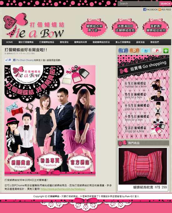 目前打個蝴蝶結歡慶開幕,在facebook上玩好康「喜歡嗎?打個蝴蝶結送給你」,隨便你來打個蝴蝶結的商店裡選你喜歡的商品,抽中了就送,讓你自己決定你自己的獎品,活動到10月底,歡迎大家來參加!