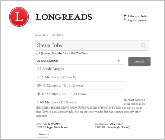 創業家說,他創立這個網站的初衷,是因為他每天上班都需要搭40分鐘的地鐵,在地鐵上使用Instapaper看著各式各樣的文章,這些文章都太短,一下子就看完,他希望利用每天難得的40分鐘來讀一些比較長、比較有深度、比較讓他思考良久的文章,於是他發明了這個「LongRead」的概念。此外,在LongReads所收集的每篇長文的前面,他還會特別註記這篇文章的「字數」,以及會花你大約幾分鐘的閱讀時間才能整篇讀完!譬如最近在Longreads頭版的這篇文章就是有2415個英文字,大約花你10分鐘時間閱讀。