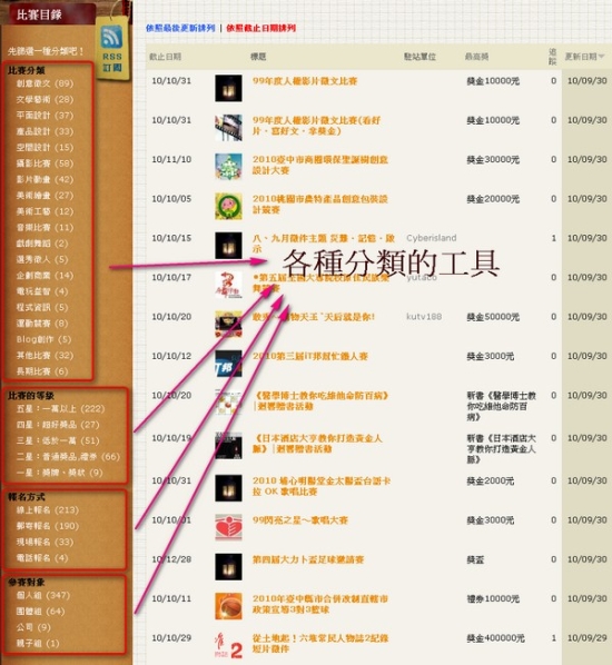 有了這些內容之後,我們開始使用各種方法來幫比賽內容做分類,比賽分類的意義在於幫助獵人朋友在找尋比賽時,能夠更快更精準的找到想參加的比賽,目前提供的分類方法有下列四種,比賽分類、比賽等級、報名方式、參賽對象,當然最常被使用的是比賽分類,本站的比賽分類共分為下列19種:創意徵文 、文學藝術、 平面設計、 產品設計、空間設計、 攝影比賽、 影片動畫、 美術繪畫、 美術工藝、 音樂比賽、 戲劇舞蹈、選秀徵人、 企劃商業、電玩益智、程式資訊、運動競賽、Blog創作、 其他比賽、 長期比賽