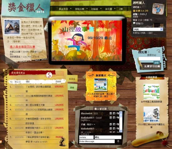 獎金獵人網站是一個致力於提供比賽全方位服務的網站,我們的團隊是由一群喜愛參與和主辦比賽的朋友所共同組成的,目前我們整個比賽鏈的計畫進行到一半,將來預計還會有比賽的建置平台、報名系統、評審制度等等的服務出現,希望能夠藉著我們對比賽產業的推動,讓每個年輕朋友可以大力的追逐自己的夢想,找到一個屬於自己的舞台,而讓這些提供舞台的主辦單位可以成本下降、意願提高,最後讓國家走向一個競爭力更高的境界,關於我們的目標與宗旨,可以參考獎金獵人wiki,Anyway大家一起來加入會員吧,成為名符其實的獎金獵人吧!!