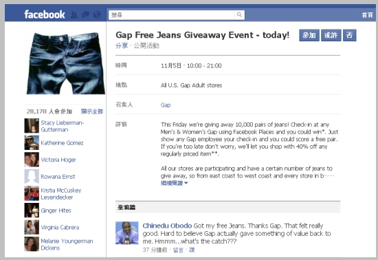 這一招也沒什麼,GAP只是開始使用facebook在美國最新啟動的「Deals」,基本上,之前有一個叫Facebook Places的東西,讓大家可以到某個地方做「check-in」的動作,但Facebook Places顯然沒有對Foursquare產生太大的威脅,所以,facebook使出更厲害的招術──他直接讓商家在Places上面說明白了,利用Facebook Places推出每日的便宜贈品,你必須要到現場打卡,或是找來三個朋友到現場打卡,還是說連續幾天打卡……就可以取得該贈品。一般推測,Facebook開Deals是「為了行銷一個產品(Places)而推出另一個產品(Deals )」,但重點是,GAP再次成為動作最快的商家之一,很快的就辦出了一場「1萬條免費牛仔褲」的活動,你只要到GAP的店裡,掏出你摯愛的智慧型手機,輕輕的使用Facebook Places來check-in,就算沒得到那1萬條免費的牛仔褲,至少也一定可以得到一件「六折的牛仔褲」,夠誠意吧!