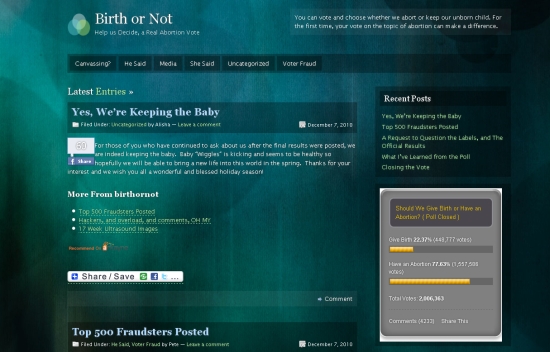 這對夫妻是在今年9月發現「中獎了」,然後他們就開了一個「Birth or Not」部落格,顯見他們心中對於這個好消息的掙扎,而這個部落格的第一篇文章就是它們兩張驗孕的照片。這對夫妻在文章中娓娓道來他們兩難的處境,也請求與網友對話,一起幫他們做~決~定。好笑的是,他們一邊兩難,一邊還是將幾周的超音波,一次又一次的放到部落格上去,網友們這三個月來也真的看著寶寶一點一點的長大,到了最近都還有寶寶13週的超音波照片,已經明顯的看出手腳了,但這個時候,這對夫婦也同時在網路上,使用PollDaddy在進行一場「殘酷的投票」,請網友直接投票,到底應該留住Baby,還是墮胎呢?
