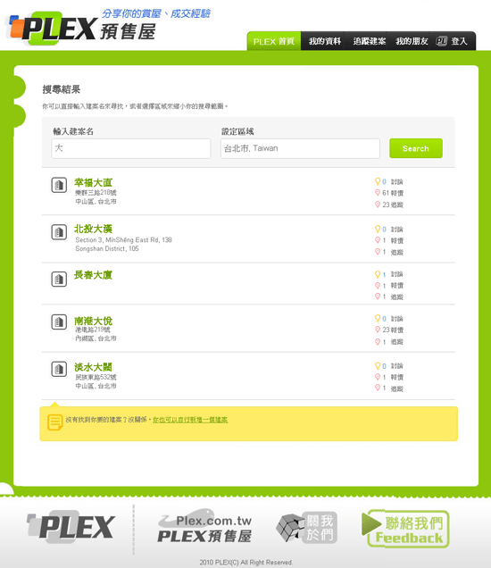附註:我們在決定是否要創立這個「PLEX預售屋網」之前,效法Mr.6增經介紹的方式,先不真的直接下去寫程式,而是先建一個Facebook粉絲專頁與一個單頁的說明網站來對外做一個測試,在沒有打什麼廣告的狀況下,竟然在4個月的期間內搜集到了超過1000個網友的email表明對我們的網站有興趣,兩度獲得蘋果日報的專文報導介紹,讓我們信心大增,立刻著手開始撰寫。相信我們以協助網友解決問題的出發點而成立的網站,是真的能對大部份的網友覺得有助益的!