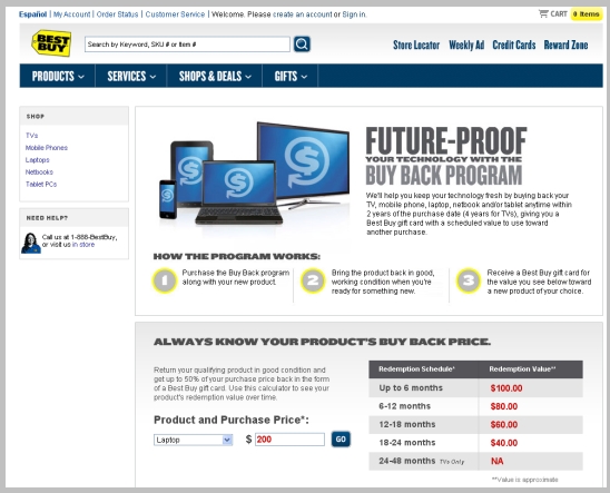 簡單,只要你加入這個「購回專案」,就可以在未來某一天,覺得自己新買的東西不夠新了,只要裡面的所有東西都還在,Best Buy「保證」可以花錢將這個東西買下來!注意,這是「保證」喔!所以你可以計算一下,在買東西的時候就確認可以退款,不過Best Buy花的錢不會是「原價」,如果你是在6個月內送回來,他們可能付50%買下,如果是12個月內,他們花40%買下,若是1年半年,他們只花30%買下,2年內他們就只花20%買下。文章說,如果是「電視機」的話,由於電視機汰換較慢,到4年後,Best Buy都願意再出10%向你買下那台電視!