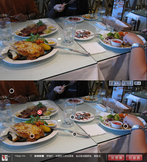 請比較上下兩圖就可以發現, 一張圖片有許多地方需要解釋,在以往實體相片的時代, 我們很熟悉一種情境, 就是親友在看照片,我們在旁邊解說,還不時會用手指在照片上比劃著, 說明這是什麼、那又是什麼,甚或直接用筆在相片上留下註記。
