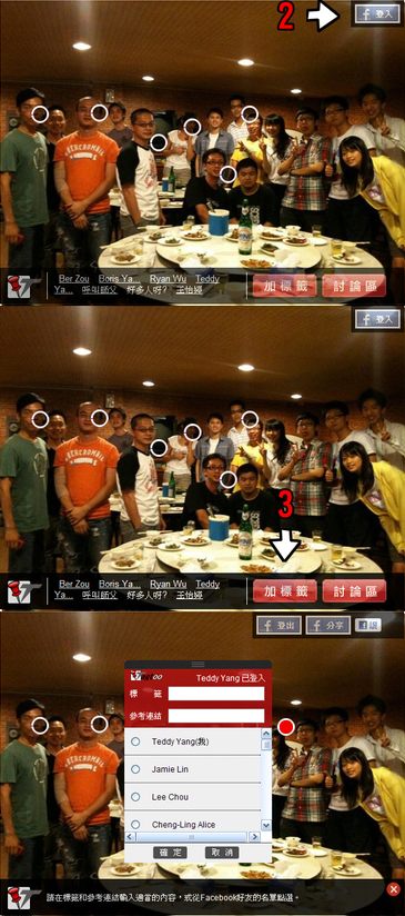 至於嵌入後要如何使用呢?基本上很簡單只要在右上角Facebook登入後點擊“加標籤“按鈕,接著在圖片上想標籤的位置點下去,跟Facebook標籤的工具一模一樣,詳細的介紹請見這篇文章:如何使用Tagtoo圖片標籤工具,或照下面圖片解析動作操作即可。
