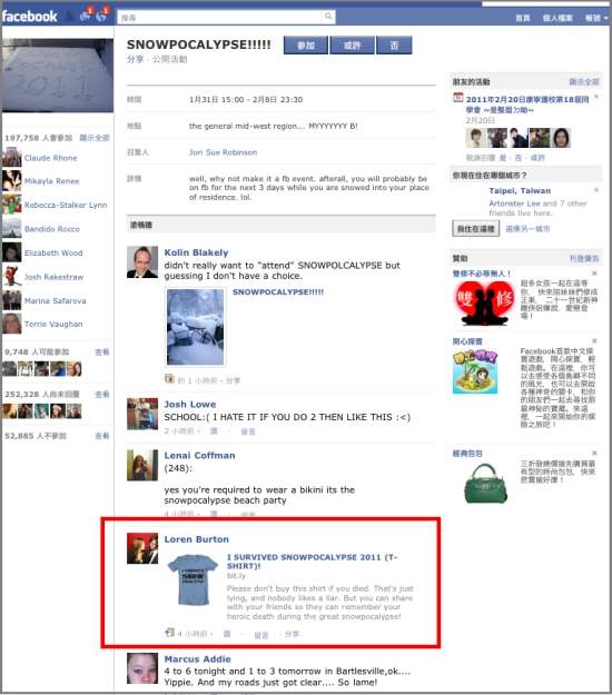 接下來,這位宅男要「行銷」他的這件沒什麼競爭力的衣服,他是怎麼做的呢?他跑到Facebook上面,搜尋這個「Snowpocalyse」關鍵字,找到了幾個正在被大量轉寄中的「Event」活動,這些活動當然不是真的有人在辦什麼活動,就是喊在那邊,讓網友自己進來「參加」、「不參加」。活動,向來是Facebook上面很容易免費操作、被轉寄、爆紅的內建工具,我們之前操作過皆有機會讓「參加」的人數遠超過粉絲專頁當時的人數,不過,活動的缺點是,無法「強迫」活動的參加者來加入粉絲專頁,優點是,如果你有什麼消息想佈達,想讓很多網友「知道」,使用「活動」有機會讓比粉絲數幾倍以上(甚至十幾倍以上)的人「知道」,但就僅止於「知道」而已。