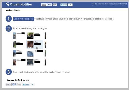有趣的是,後來這個「分手通知器」,很快被Facebook給禁掉了,而這位原創者氣憤之餘,也馬上也又生出了另一個創意,叫做「Crush Notifier」(暗戀通知器),它的概念有點類似,就是你偷偷「暗戀」某個人?你就只要告訴「暗戀通知器」就好了,這個網站會幫你守住秘密,不會告訴當事人,只會寄一封匿名的「暗戀通知信」給當事人!這時候,當事人循線來到此網站,若也告訴網站,她偷偷的在暗戀「你」,那麼,Crush Notifier就會將這個大好消息,寄給你們倆知道,接下來就看看你們倆要怎麼辦了!