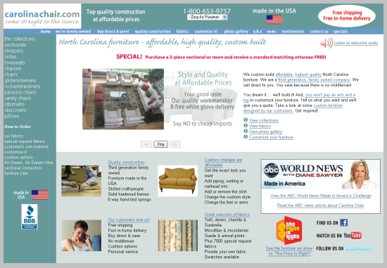 他試圖說服使用者,一般人看家具,選擇當地的某一店,走進去直接看,但東看西看、南看北看,其實根本看不出哪一個品質高、品質低,家具的「來源」也不明。但,這個網站CarolinaChair.com就是在線上教育使用者,讓他們瞭解,不要到當地的實體店面買,而是要到線上買,買到100%的美國製的家具!