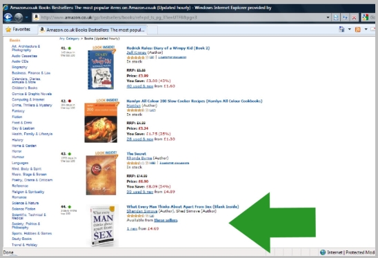 現在,這位作家的第三本書,就是這本空白的《每一個男人除了性以外所想的事情》,完全沒有任何有趣、深度的思想寫在書內。他找上一間公關創意公司幫忙,他們先開了一個Facebook Group,號召一起買這本「空白書」來將名作家的書打下亞馬遜排行榜,後來再出了一份新聞稿號稱現在一些大學生都以這本書當作自己的筆記簿(不知道是真的假的)……。