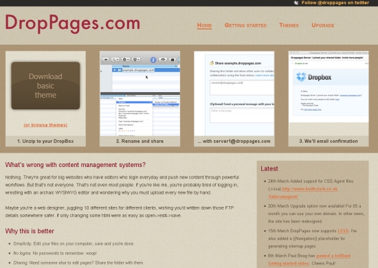 而DropPages的概念,其實是一套「內容管理系統」(Content Management System,簡稱CMS),內容管理系統就是「簡易網站」的雅稱,換句話說,你不再只能使用Dropbox來同步備份電腦裡的檔案到雲端,今後,還可以將你本來在雲端的「網站」,直接放在自己電腦裡面!