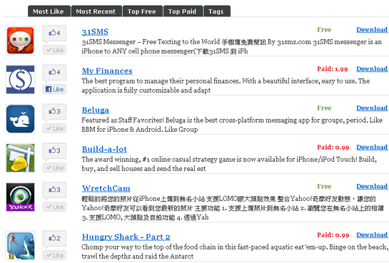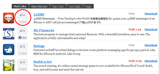 答案:透過Facebook 的「讚」, iLikeApp.cc統計每個apps被按下「讚」的次數,並且提供根據「讚」糙數排序的功能,讓你根據最多人按「讚」的方式,