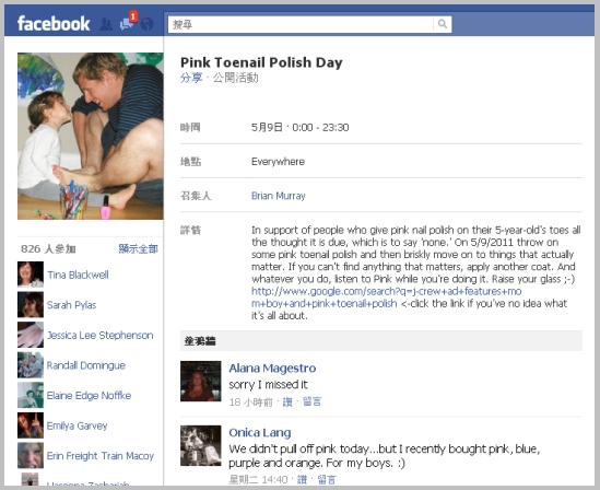 不過,另一派也不遑多讓,有人另外發起Facebook宣傳活動,要大家加入。這個發起的男士,還很好笑的找來他的「女兒」,模仿了那個創意總監的動作,只是他和他的女兒「對調」,變成女兒在塗這位男士的腳趾頭,塗成「粉紅色」!不過這場活動只有826人「參加」,並沒有在臉書上爆紅。另外還有一位生物學的女教授也跑到心理學的專業部落格發表她的支持,認為這個年齡的小朋友還是一直在嘗試、發覺、學習,他們會慢慢發展成比我們這一代還要「更有趣」的「新人類」。
