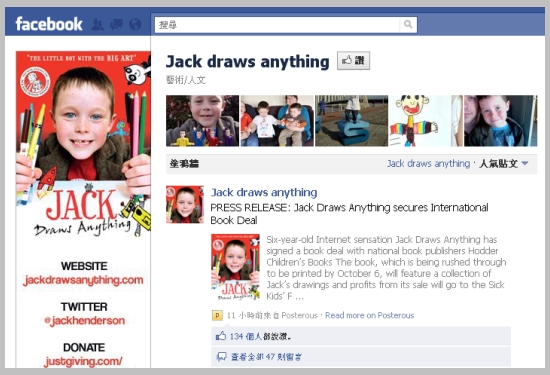 研究Jack的部落格的爆紅關鍵,在沒有登上主流媒體的情況下,誰會知道有一個六歲的Jack開了這個部落格要募款捐醫院呢?答案又是在「Facebook」,原來,Jack在5月15日,也就是上星期日,才剛開了他們的Facebook粉絲專頁,這個粉絲專頁果然發揮了「請朋友傳給其他人」的力量,才開了一週,就被那家出版社看到,也被主流媒體看到;從上星期到現在,這個粉絲專頁的粉絲數就在完全沒有其他的幫忙下,增加到3000多人,人數雖然不多,但已經發揮了「請朋友告訴大家」的效果。他們訪問Jack的父母,他爸爸說:「我們為Jack感到光榮,我們為我們三個兒子都感到光榮(據說兩位弟弟,包括生病的Noah,都會幫六歲的哥哥一起畫、塗顏色)。」