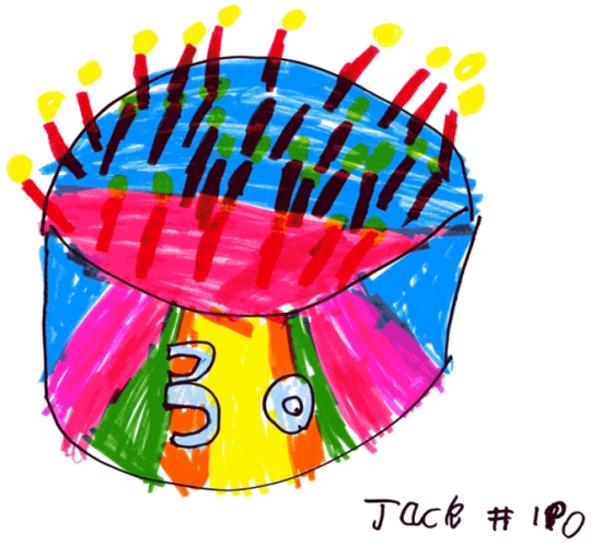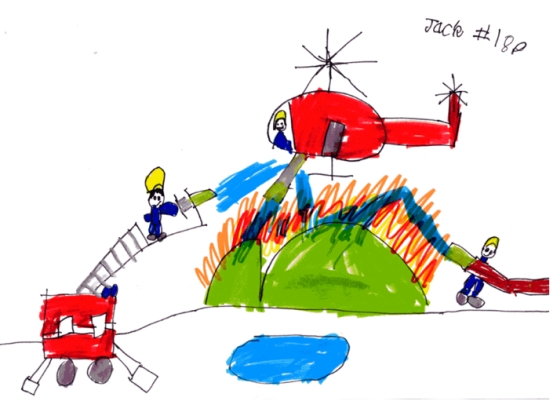 可是,小小的Jack沒有錢,撲滿整個帶過去恐怕連一次醫藥費都付不起,於是小小的Jack決定,幫他的「朋友」們作畫,Jack才六歲,所以他的捧油大概也是三歲到六歲的小朋友,這些小朋友網友,請Jack畫什麼,他就照著畫一張,然後開了一個叫做「Jack Draws Anything」的部落格,將這些童言童語的畫作,放到網路上面去。大家看到這些畫作,知道這個故事,可以對Jack的醫院進行捐款。