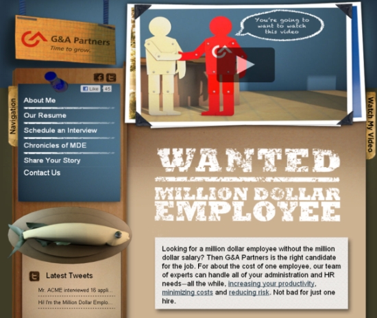 來看看就會發現,其實這不是一個想找工作的人,而是一家專作HR(人力資源)的服務外包公司,有些小公司自行聘用人資主管或人資人員,做得不專業又零零落落,於是可以包給這種HR外包公司去處理薪資、績效評估、教育訓練…等;像這種與企業溝通的公司實在一大堆,每一家的官網都很有特色,實在很難脫穎而出!於是G&A就開了這麼一個「百萬員工.com」宣傳自己的服務,還煞有其事的做了一個cover letter(美國人投履歷都要先附上一封說明來意的信函),接著附上「履歷表」,如果你想面試這位「百萬員工」可以填寫面試要求單……這樣的行銷官網,實在比一般microsite還讓人感同身受這間公司想表達的訊息──