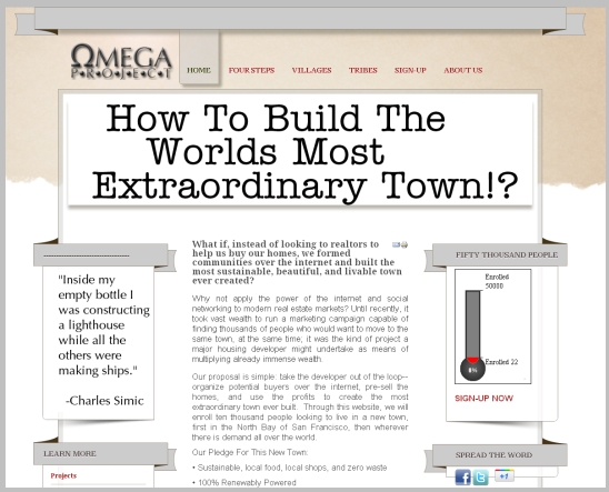 請注意,如果以網路行銷的角度來看,OMEGA Project也是一招很妙的行銷手法──我猜,會不會它根本就是某個建商所發起的?坦白說,25萬美元一間房子,也沒有便宜到哪裡去,但對於網友來講,他們雖然住得遠了一點,卻可以透過「自己集結」來造出一個自己喜歡的模樣,而這個模樣(譬如有機、再生能源、零失業率)還真的是目前這些造鎮的建商不見得有提供到的程度。網路是一個作夢的地方,建商如果是OMEGA Project背後的隱型操作者,那我真的要對這家建商致以最高的敬意!太高明的操作了!