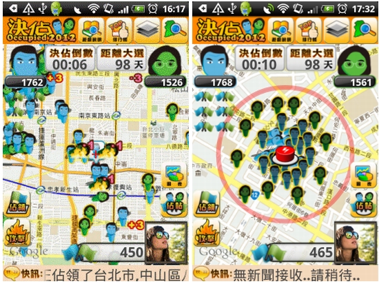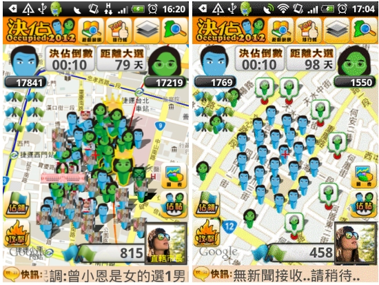 •LBS:透過LBS,更能夠準確判斷周遭藍、綠陣營的實力跟勢力範圍。(看看住家附近是藍是綠?)
