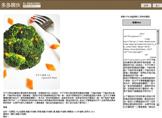 為了讓本來就在經營網誌的使用者,方便將食譜同步發表到網誌;使用者只要點擊【複製 html】的按鈕,到自己的blog用html格式貼入,10秒不到就可以立刻完成網誌發布,不用為了同步文章,多花15分鐘來傳照片和剪貼文字。參考將食譜,利用同步功能貼到網誌後的效果請見這裡。