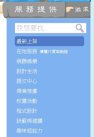 只要把滑鼠指標移上去,就可以知道這個分類裡面有哪些類型的服務,針對服務提供和想要徵求服務的人,有兩種明確的介面可以點選,更棒的是,還有搜尋功能呢!