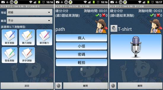 1. 單字測驗:測驗前可依自己的程度選擇單字等級、難度、及測驗類型。測驗方式為顯示英文單字或系統唸出單字,請使用者選出正確的中文意思。每次單字測驗結束時系統會顯示成績單,還可將記錄上傳至網站跟大家比拼一下!