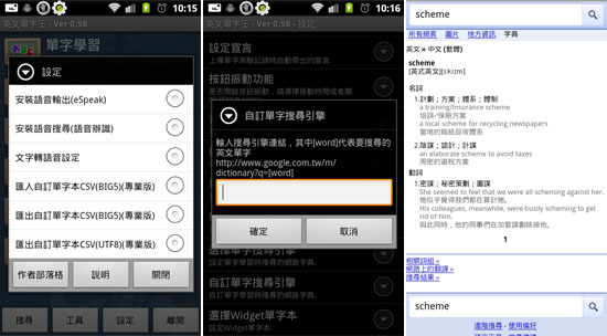 4. 自訂單字搜尋連結:Google字典查詢按鈕可依使用者需求彈性設定自己喜歡的單字搜尋連結,讓你可到連結上查詢更多的解釋與例句。