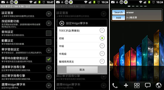 另外在桌面上提供Widget 功能,讓你不管何時使用手機時都能看到它提供的單字,讓你在無時無刻學習英文、增加英文單字量。在 Widget 有兩個小按鈕,”搜尋”提供查詢單字的功能,隨時隨地都可如行動字典般的使用;”新增”則可讓你快速的新增單字到自訂單字本中,任何單字都不會遺漏。