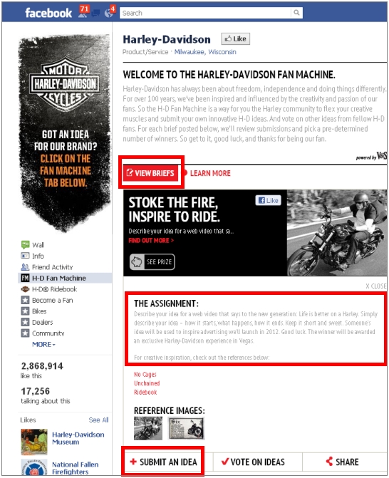 哈雷機車的行銷部門認為,這個品牌,對於18~34歲的族群已不若以往這麼強烈,而這個族群恰恰好正是Facebook的中堅份子,哈雷粉絲團高達286萬人了,因此,他們決定直接將整個哈雷機車的「行銷專案」外包,請286萬個網友幫、它、想!