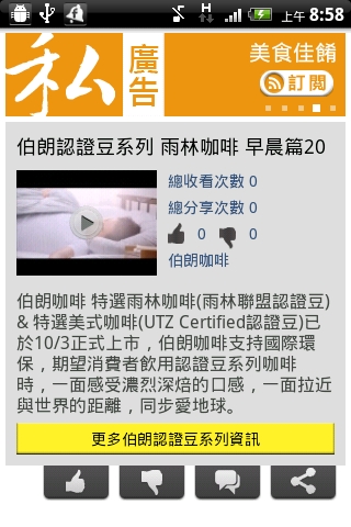 我們認為廣告影片是非常適合在行動裝置上播出的內容,內容經過精心設計,能夠30到60秒說一個故事,符合行動裝置的輕媒體特性。FREEdi私廣告採先下載後收看的方式,不需要為了流暢播放犧牲影像品質,使用者收看時立即播放免等待,更不可能意外中斷,不但提昇使用經驗,廣告主的產品訊息也能完整表達。同時由於影片已經保存在手機內,使用者有機會多次收看,或是利用傳閱或是近距離傳輸的方式分享給朋友,這些廣告主都不需要額外花費。