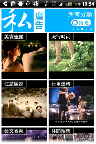 私廣告不僅投放獎勵式廣告,我們每天都會提供十二大類的廣告影片讓使用者收看,包括美食佳餚、流行時尚、住屋居家、行車運輸、藝文教育、休閒娛樂、百貨購物、媒體影視、3C科技、工商理財、衛生保健與公眾服務,內容不只有一般商業廣告,還包括電影預告、電玩介紹、運動精采畫面、節目花絮或流行資訊等。