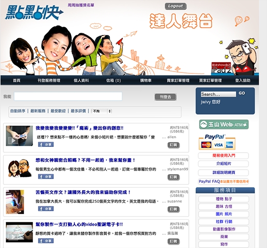 均一價,交易快速,只要你敢秀,國際舞台就是你的!在這裡,你在站內的金額可以隨時主動地停領出來。而且,購買和提領是不需要你支付手續費的。譬如,你用PayPal或網路ATM購買,買方都免付手續費 ; 會員如要提領我們網站內所賺取的金額到PayPal,這交易手需費也是網站支付的。為了讓這網站能國際化,用來購買的幣別除了台幣之外(用網路ATM時),我們還提供美金(用PayPal或信用卡時)。交易快速,賣家一旦在刊登時承諾的幾天內完成時,最慢48小時,此訂單就會結案完成,賣家立刻入帳。同時,買賣雙方都有方便的退款機制,不會讓”怨偶”難分難解!此舞台上的服務商品售價是採用像日本大創商店型態的均一價制度 – 6美元(台灣可用網路ATM付款180元台幣。交易流程採網站拖管制,買方購買服務商品時,先付款給網站,待交易完成時,在把錢給賣方。網路金流機制採用PayPal收付款,所以在上面的網民有很多是來自香港等非台灣的華人。