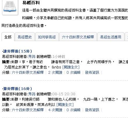 並可將所有相關易經的文獻,包括兩派六宗甚至十宗提供給網友作為易經的聯結。將中國文化透過網路發展到全世界