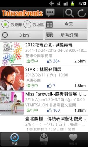 逛完街買完東西後,還有時間想打發掉?透過APP的LBS搜尋功能,馬上就能知道附近三公里內有哪些活動正在進行,也許去藝廊看個畫展也不錯!