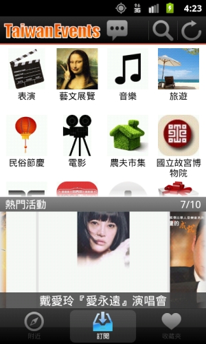 APP提供了上千筆藝文表演、展覽、音樂、旅遊、民俗節慶等活動,你可以依據自己的喜好選擇要訂閱的活動類型。換句話說,活動報馬仔就像個RSS新聞閱讀器,可以自由選擇新增或刪除訂閱來源。