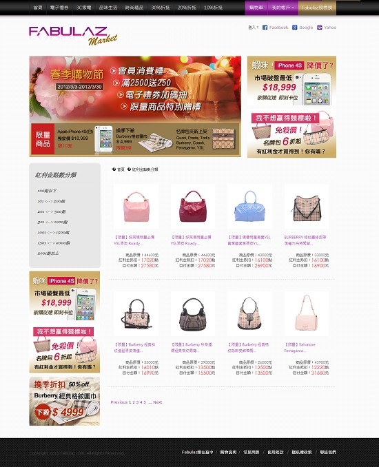 簡單來說,你可以把Fabulaz想像成兩棟『虛擬精品百貨公司』,FA館提供競標服務,目前規劃的七個樓層分別是:1樓時尚精品、2樓流行3C、3樓品味食遊、4樓美妝保養、5樓潮流生活、6樓購物禮券、7樓新手專區。會員的首要目標當然是先選好標的、標得FA館中所陳列的商品。只要把FA(發)幣、禮幣準備好,就有機會用超低折扣把Gucci包、iPhone4S 標到手。