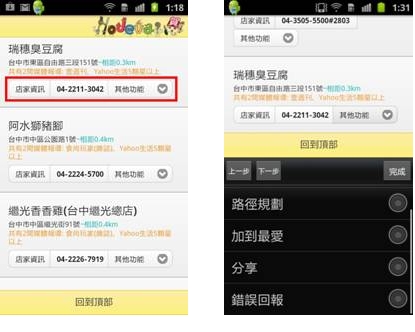 以LBS(Location Base Service)技術開發的"附近美食"功能則能依照使用者所在位置精準找出附近的美食店家資訊!