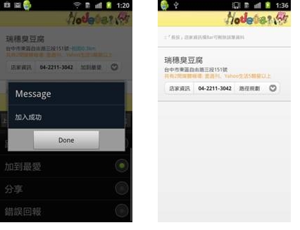值得一提的是「Hojava賀呷嗎」加入最愛的功能,讓沒有3G吃到飽的朋友也可以離線瀏覽!只要在有網路的環境把店家加入最愛,以後就不需要開啟網路,在我的最愛當中就可以看見店家資訊了!