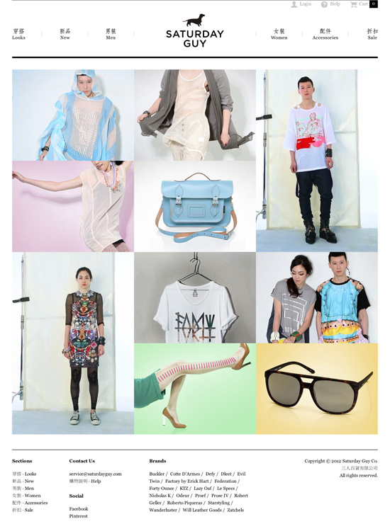 SATURDAY GUY是一家由三個來自不同背景的台灣人所共同創立的線上boutique。一個才情洋溢的多媒體設計師、一個旅居紐約下城的It Girl和一個慧眼獨具的視覺藝術家,在文化創意產業興盛的現下,有感於台灣對時尚資訊仍然匱乏,於是在共同邁入而立之年後,決定攜手策劃一場關於品味與美學的反動。