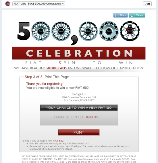 然而,真正特別的是FIAT的第二種獎品。主辦單位宣稱,是真的「只」給那先加入的50萬名粉絲,只要你是那50萬名其中一位,你可以拿到500美元的「買車金」!