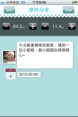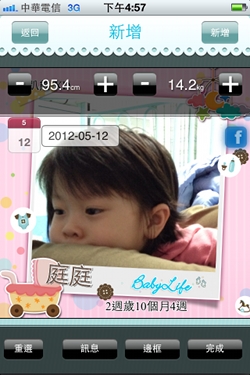 BabyLife 主要是以照片和文字的方式來記錄寶寶的成長過程,並加上「成長曲線」與「疫苗記錄」這兩個寶寶專用的紀錄功能。照片的部分,可以選擇直接拍攝,或是從手機現有的照片中選取,接著 BabyLife 便會直接抓取照片拍攝的時間,自動算出寶寶的年齡,不需要爸爸媽媽再另外去計算。除了照片與年齡外,還可輸入身高、體重、以及額外的文字敘述,讓整個片刻的記錄更多元、豐富。另外,點擊 Facebook 的圖示成藍色狀態,即可將照片同步上傳到 Facebook 上,與更多親友分享寶寶可愛的照片。