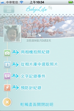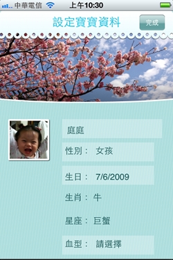 第一次開啟 BabyLife 時,會請使用者以 Facebook 帳號進行登入認證的動作;之所以選擇使用 Facebook 帳號,主要就是讓使用者不需要再註冊另外的帳號、密碼,也方便日後將照片分享到 Facebook 上(可選擇)。登入帳號後,先來設定寶寶的資料吧~除了寶寶的姓名、性別、生日、以及血型外,還可以幫寶寶挑張可愛的大頭照及漂亮的背景圖;接下來,就可以開始使用BabyLife 來記錄寶寶的生活囉~