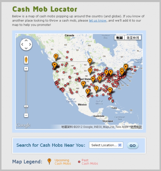 無論是去年八月,還是去年十一月,總之,「快錢族」的新玩法,到現在也才半年多的歷史,不過,它卻默默的在全美國燃燒中!目前美國已有32州以及加拿大辦過「快錢族」活動,你看看一個網站「Cashmob.com」就附上一張很是震撼的地圖──你可以看到,不久未來準備舉辦的「快錢族」活動,竟有高達20個,而這半年來舉辦過的「快錢族」活動呢?已經密密麻麻超過一百個以上,遍佈全美國!