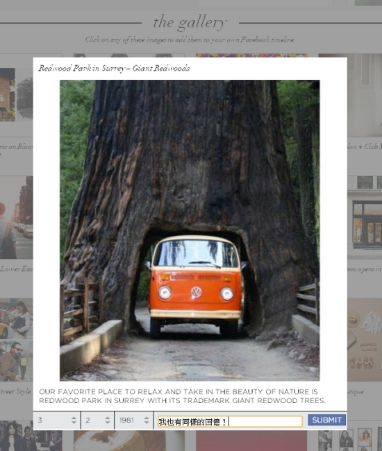 來到這個活動的主頁面,回憶都在這裡了。頁面上承現一塊又一塊的「回憶」,CLUB MONACO自己先幫觀眾找妥回憶素材,讓觀眾自己選回憶,再加上自己的註解,放到自己的Timeline上去。當然,這些「回憶」肯定經過「精挑細選」,一定和CLUB MONACO有很大相關,一定也夠空間來和網友自己的回憶扯上關係,譬如上方一張圖片是那個知名的美國大樹洞,裡面停一輛福斯麵包車,這兩樣東西,都有可能勾起你我的回憶,而這些這些的照片,本身都一定是緊緊的釦住CLUB MONACO的品牌定位及客群特色,網友一邊選了一張古色古香的照片,一邊在被CLUB MONACO的品牌洗腦。