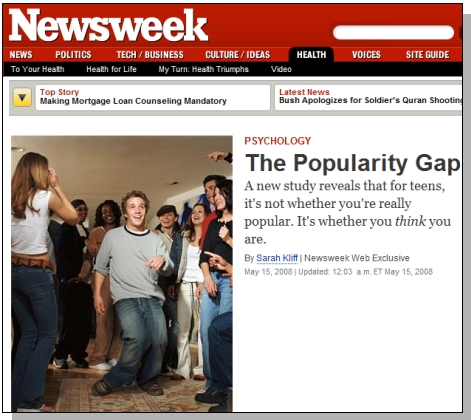 在這篇文章中,科學家對一個班級的163位學童做了長達一年的實驗。他們問每一位同學,你們在周六願意約哪些同學出去玩?然後再問他們,他們自己認為自己受班上同學歡迎的程度。結果發現,受他人歡迎的「人氣王」,自己好像都不認為自己有這麼受歡迎!反而那些自己認為自己是「人氣王」的,沒有同學私下選他。結果,這麼多實驗對象中,竟然只有25%呈現「別人喜歡他,他也自認人氣高」,其他的75%,全都「搞錯了」。