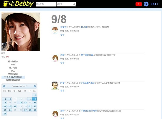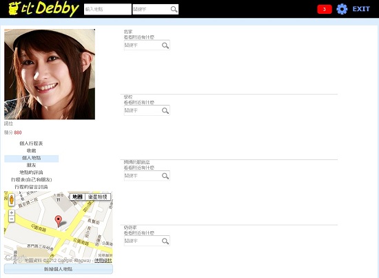 相信大家都會想著在下課、下班後、假日時,可以去哪些自己想去的地方,譬如風景區、海邊、燒肉餐廳、日式料理,但是想去自己感興趣的地方,又和朋友有很大的關係,畢竟不管去哪裡,自己去都會很無聊,一定要和朋友一起去才有趣,debby黛比這個網站就是希望幫助您與朋友在這方面的互動,您可以了解朋友們感興趣的地方、去過的地方、未來想去的地方,而且當您在debby黛比尋找一些您感興趣的地方時,譬如臺北市立動物園,可以知道附近有沒有朋友們的家、學校、公司、朋友開的商店…等和朋友習習相關的”個人地點”;也可以知道附近有沒有朋友們感興趣的地方;或者是這個地方朋友是否來過、以後是否會來。
