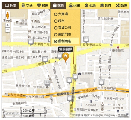 特別值得推薦的是我們地圖上的 POI (Point of Interest)資訊,圖中以便利商店為例子,勾選便利商店之後就可以看到該物件周邊所有的便利商店位置囉!滑鼠游標移過去還會告訴你他是哪一家便利商店以及他的店名。除了便利商店之外也有學校、車站、醫院、藥局、電影院和郵局等資訊。